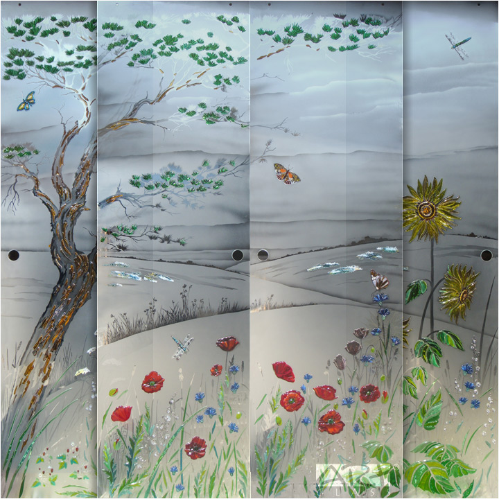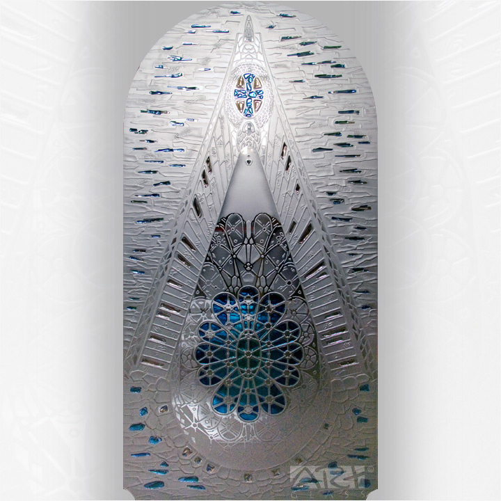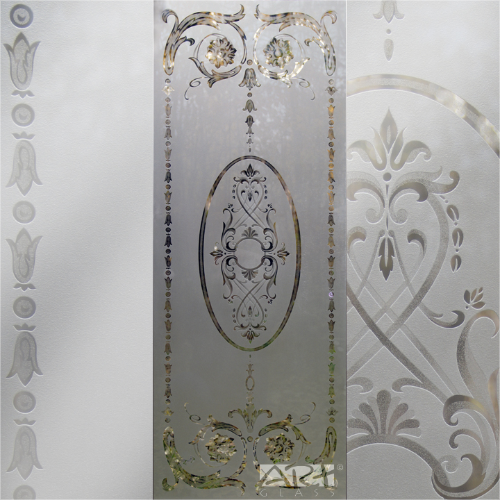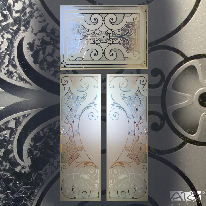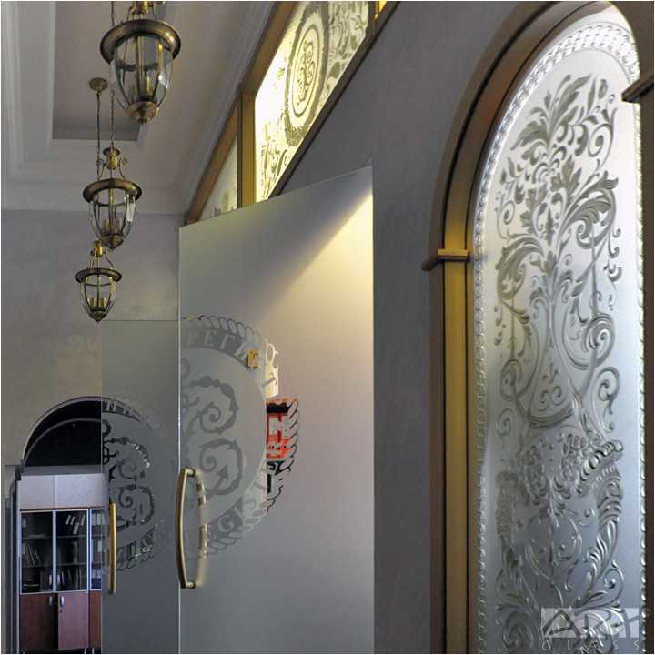 Витражное, мозаичное, пескоструйное декорирование стеклянных дверей, перегородок, и других стеклянных деталей архитектурных и интерьерных конструкций и их элементов возможно по индивидуальному проекту или по каталогу дизайн разработок нашей компании.