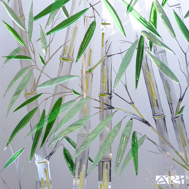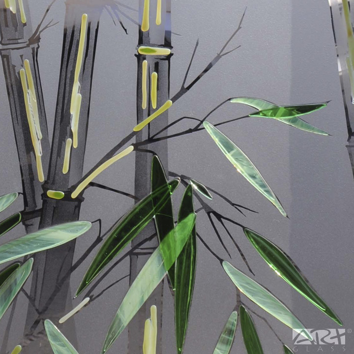 Стеклянная дверь «Бамбуковая роща» коллекции «АРТ-ГЛАСС» выполнена из закалённого осветлённого стекла в технике пескоструйного декорирования и украшена моллированными элементами из цветного витражного стекла.