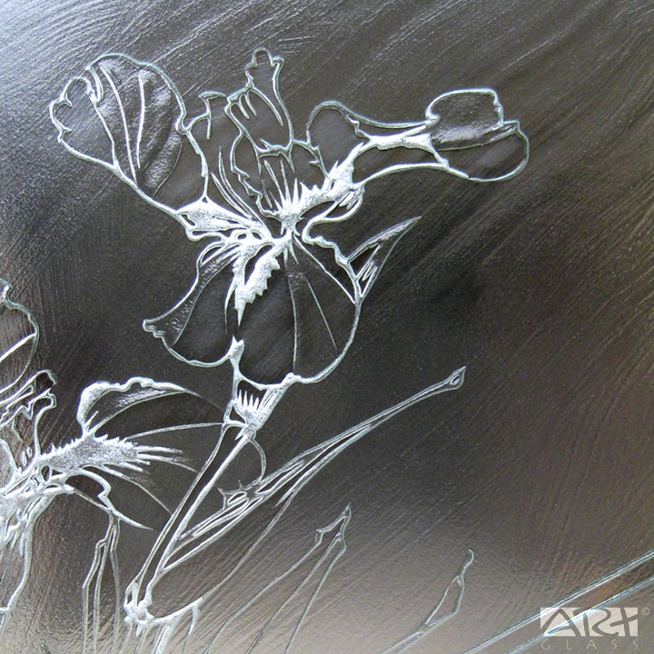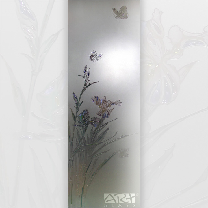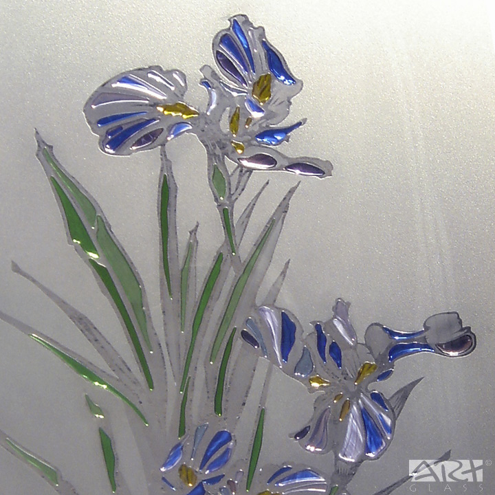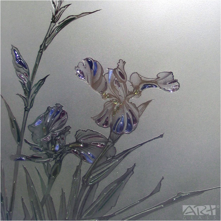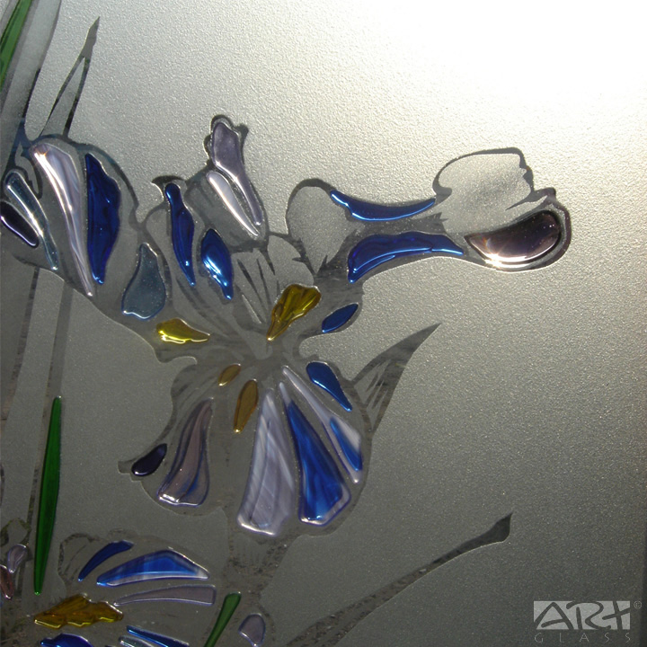 Основой витражной двери «Ирис» из коллекции «АРТ-ГЛАСС» служит осветлённое закалённое стекло, рисунок выполнен в технике пескоструйной гравировки, стеклянные детали лепестков и листьев витража изготовлены путём спекания между собой нескольких слоёв цветного витражного стекла.