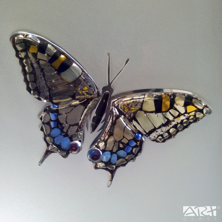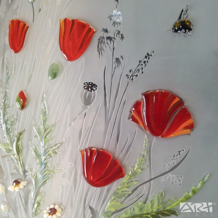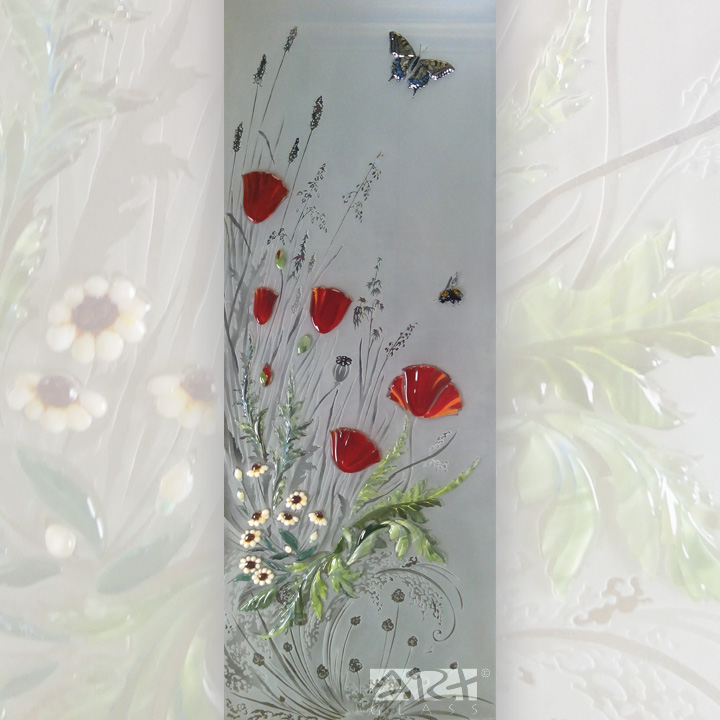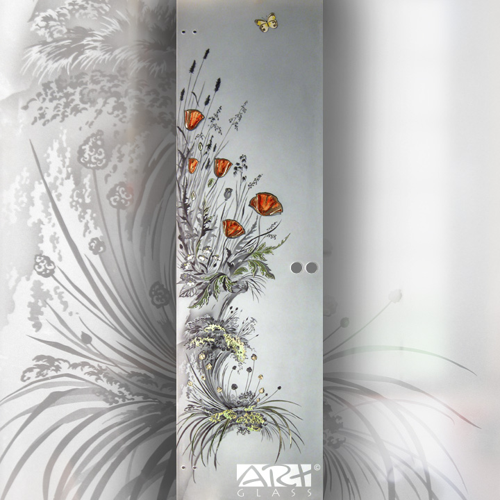 Пескоструйный витраж с фьюзингом - «Маки с бабочкой», для стеклянной двери или перегородки, станет настоящим украшением и великолепным акцентом интерьера, подарит удивительное, жизнерадостное, легкое и солнечное настроение.