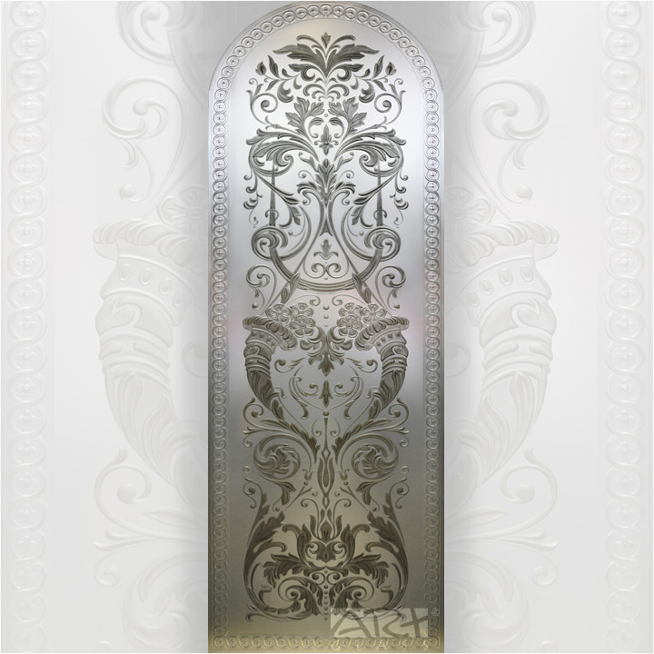 Подчёркнуто упорядоченный и симметричный авторский рисунок «Аркада - классика», был специально создан «АРТ-ГЛАСС», для оформления декоративных элементов из стекла в интерьерах офиса Ассоциации по сертификации «Русский Регистр», на основе орнаментальных мотивов позднего классицизма и имперского стиля.