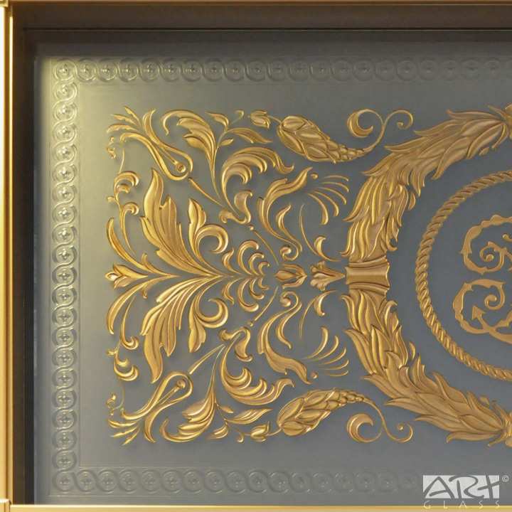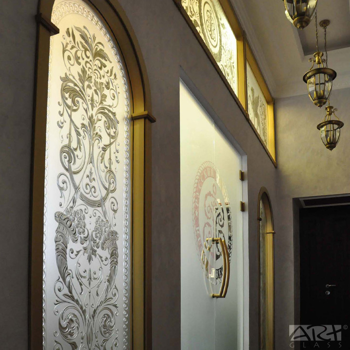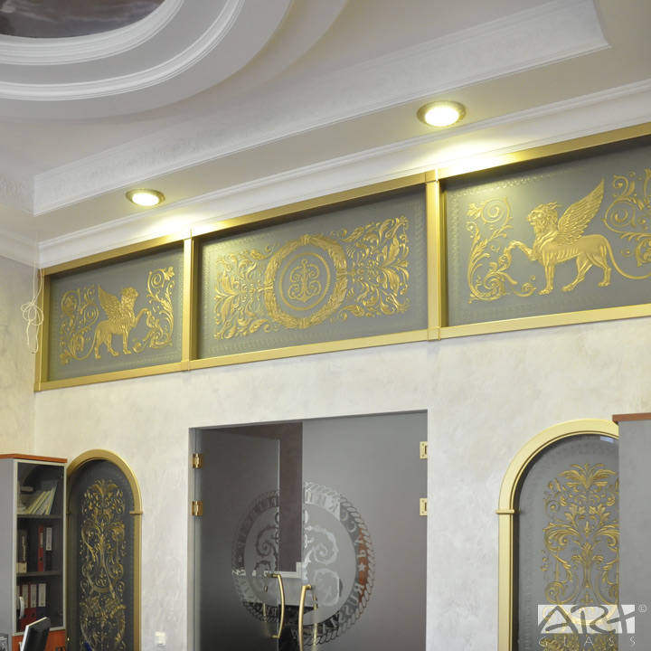 Классическая строгость, торжественность и парадность, блеск и роскошь стеклянных дверей и витражных деталей, выполненных в технике глубокой многоплановой пескоструйной гравировки с золочением, делает их достойным украшением респектабельного интерьера.
