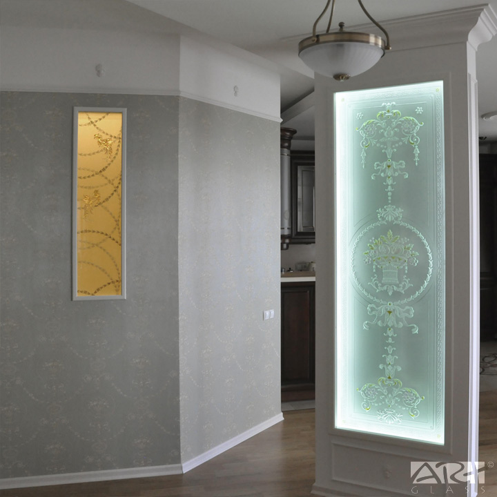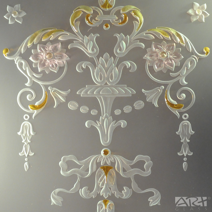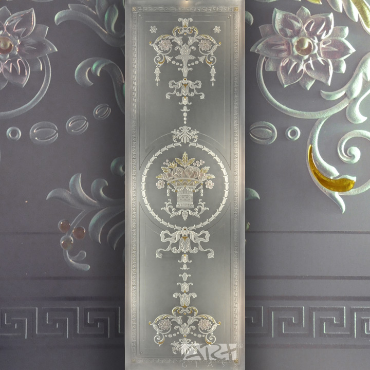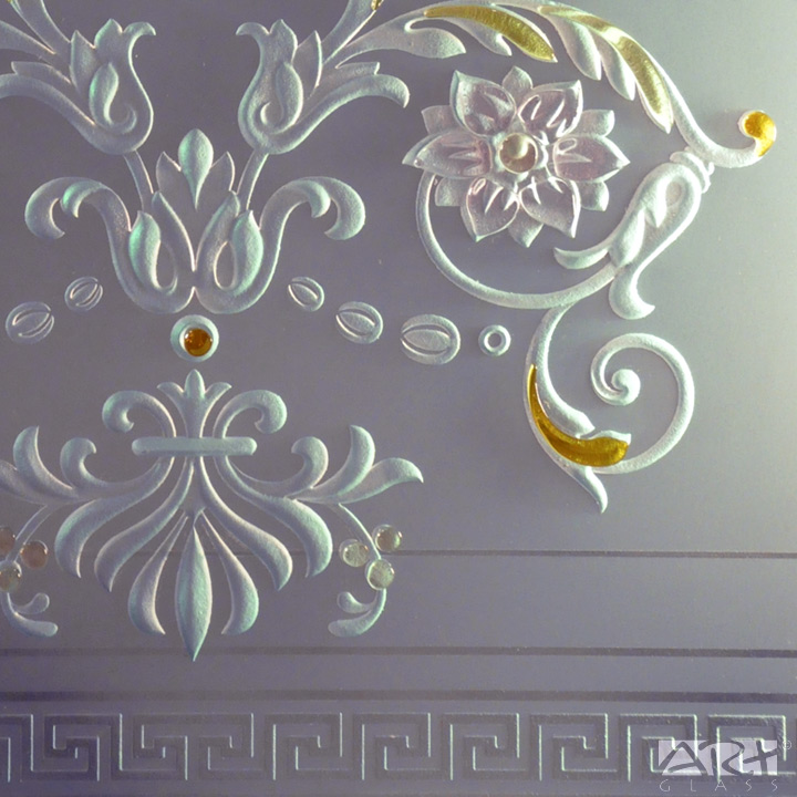 Стеклянная дверь с фьюзингом украшенная классическими, нежными и изысканными, орнаментальными и цветочными мотивами, станет главным украшением или прекрасным легким акцентом интерьера оформленного в романтическом стиле и подарит удивительную атмосферу свежести Лазурного берега Средиземноморья, комфортное, уютное и спокойное, романтичное настроение.