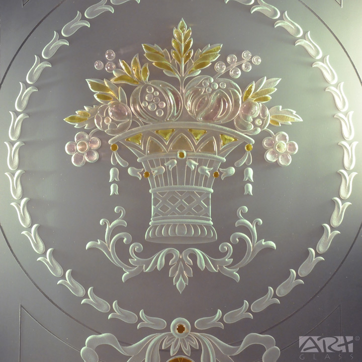 Романтичный рисунок «Букет-классика» для витражной стеклянной двери из коллекции «АРТ-ГЛАСС» вобрал в себя наиболее изысканные классические мотивы барокко и ампира.