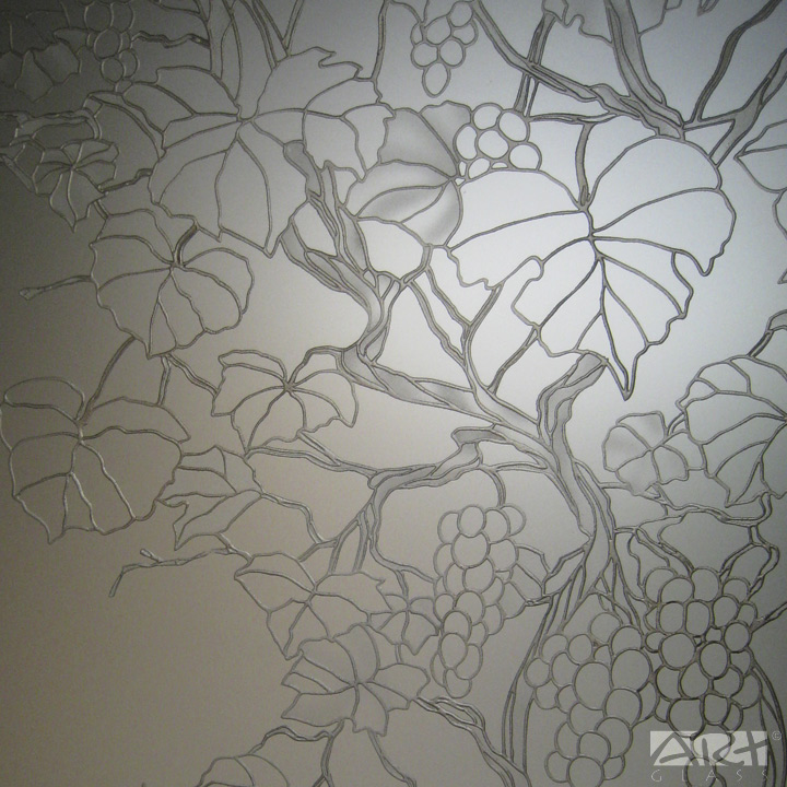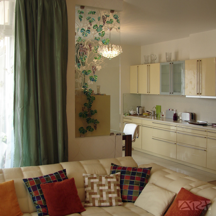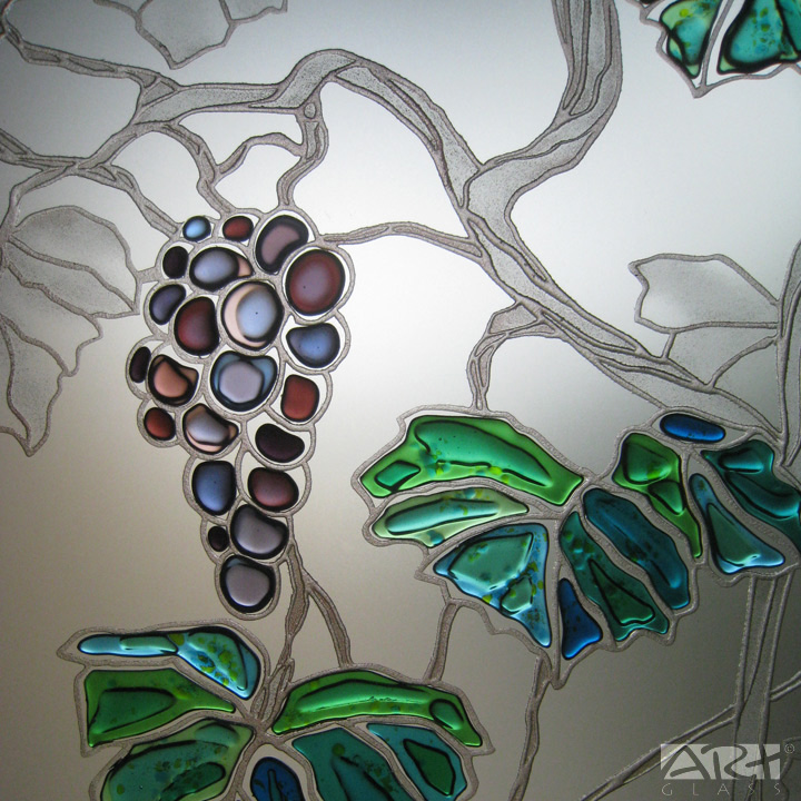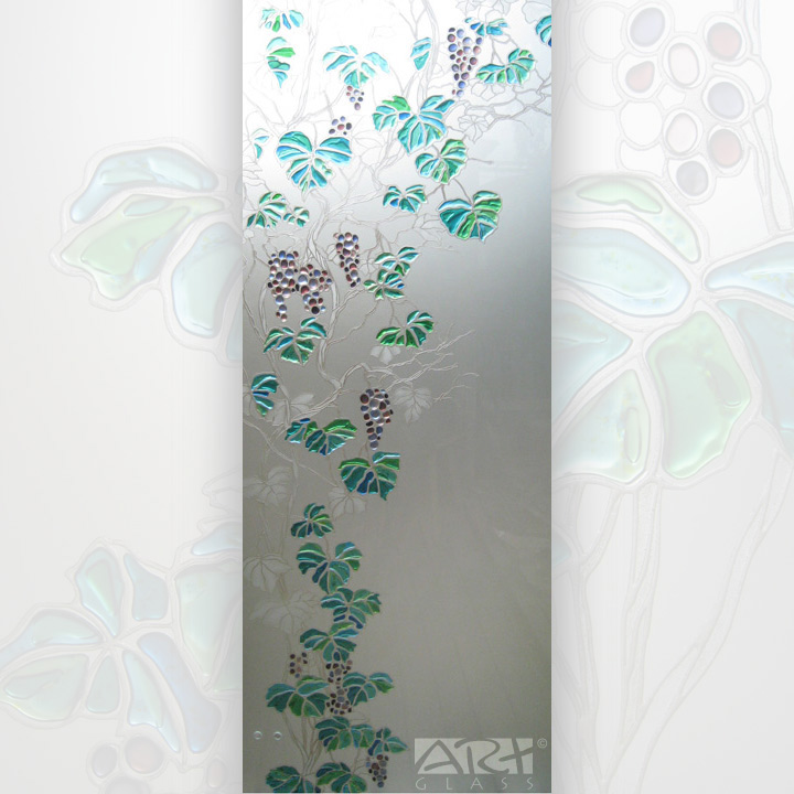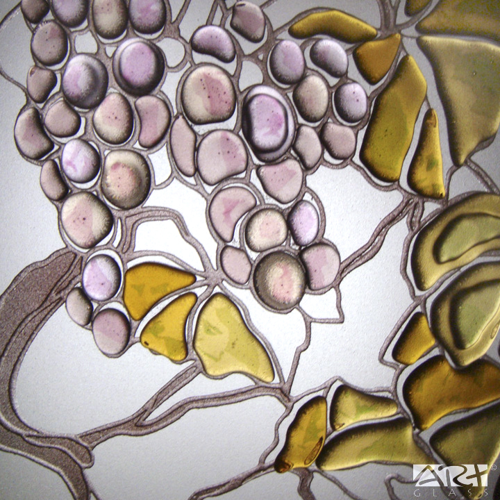 Перегородка из закалённого осветлённого стекла с рисунком «Виноград» выполнена в технике многопланового пескоструйного декорирования с фьюзингом, цветные объёмные детали изготовлены из витражного моллированного стекла.