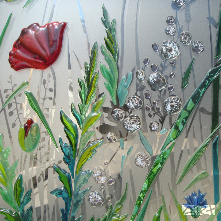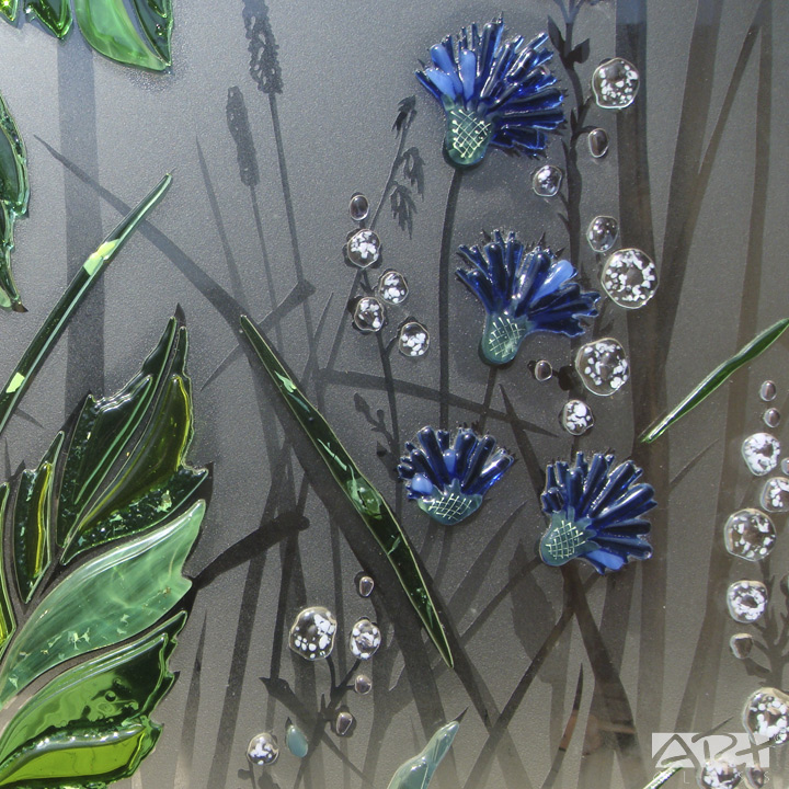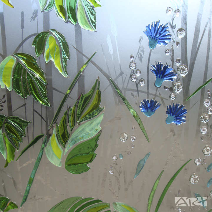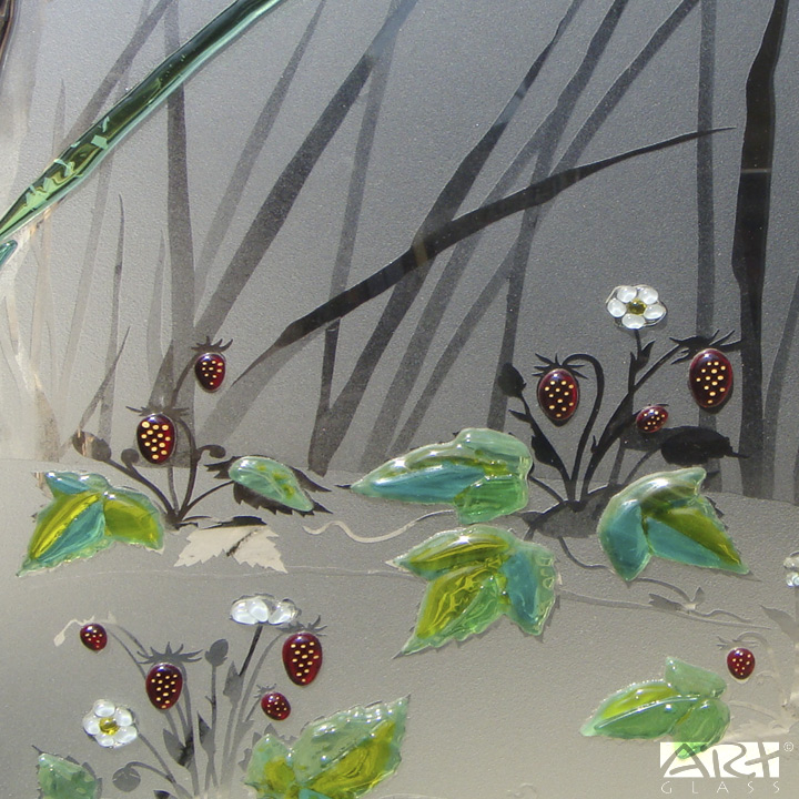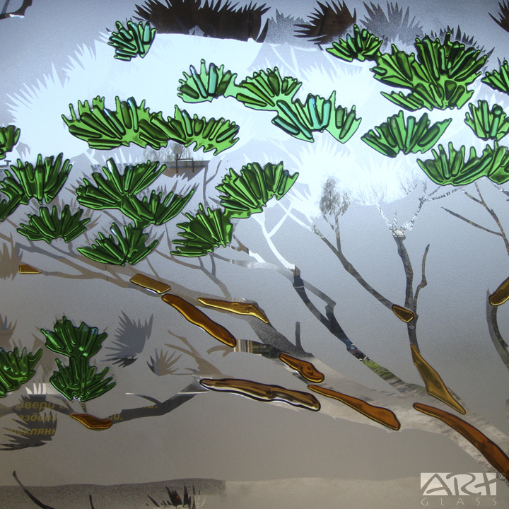 Раздвижная перегородка из стекла коллекции «АРТ-ГЛАСС» с авторским рисунком «Дверь в лето», выполнена в технике многопланового пескоструйного декорирования и украшена сложными многослойными деталями из цветного витражного стекла.