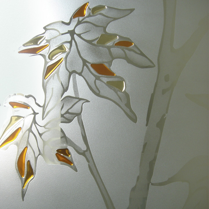 Рисунок «Клен» может быть выполнен на прозрачном или матовом фоне. Плотность рисунка, степень прозрачности стекла, цвет и общее количество элементов фьюзинга могут изменяться, по желанию.