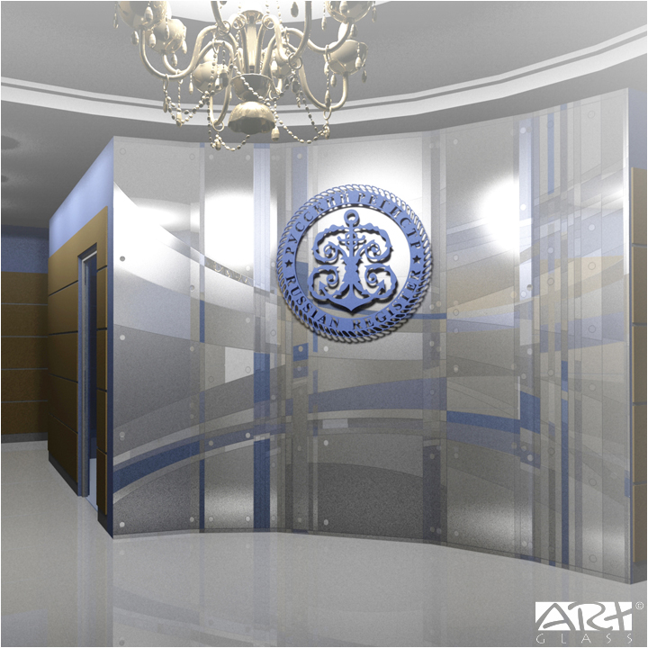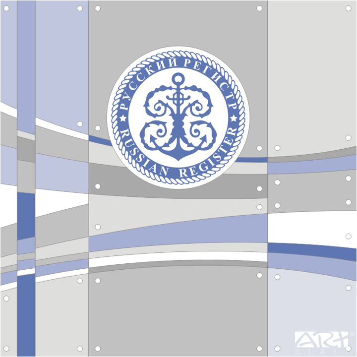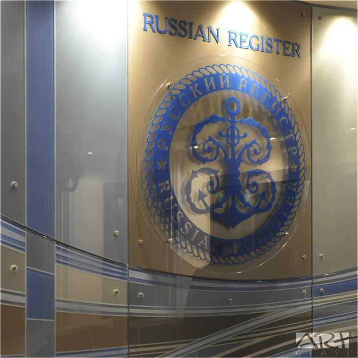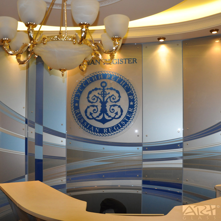 Основной элемент декоративного оформления интерьера приёмной центрального офиса Ассоциации по сертификации «Русский Регистр» - декоративное стеклянное панно, своеобразная визитная карточка, разработанная по проекту Алексея Баранова и созданная в нашей творческой мастерской.